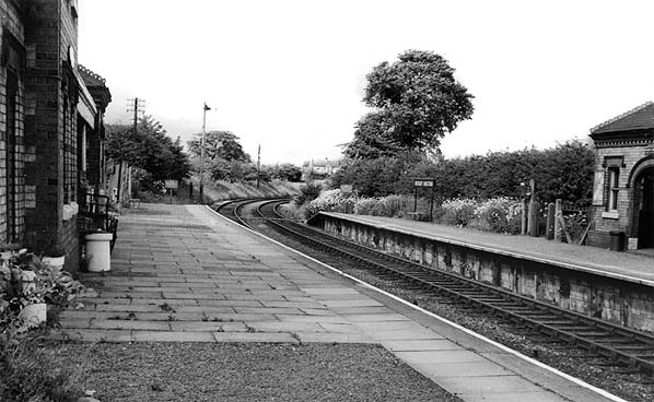 Looking north from the northbound (down) platform at Buckley Junction station in the 1960s. The route of the Hawarden Loop can be seen curving away to the right. The original line to Buckley Old Station was to the left behind the station building.
