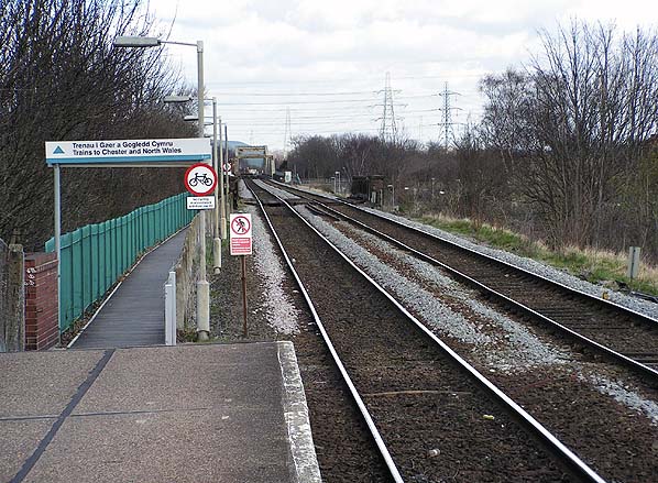 Looking north from Shotton station towards the point where the WM&CQR Hawarden Loop line made an end-on connection with the MS&LR Chester Northgate line as seen in March 2011. The systems made an end-on connection at about the point marked by a grey metal box in the middle distance on the right side of the line. There had also been a junction at this point where a WM&CQR branch went off to the left and ran down to Connahs Quay.