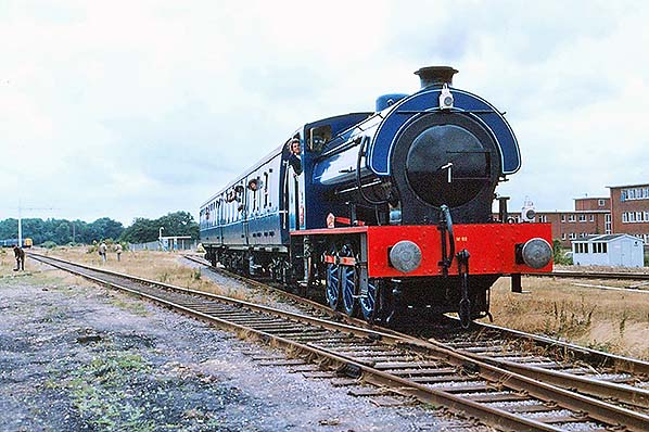 During the July 1978 open day, Army No.92 is seen leaving the exchange sidings with Marchwood's passenger train which at the time comprised two ex BR Mk1 vehicles. A BR train comprising a pair of Southern Region DEMU's can be seen in the exchange sidings, left background. The DEMU facing the camera is a member of what became Class 207 and originally known variously as '3D', 'Oxted' or 'East Sussex' units.