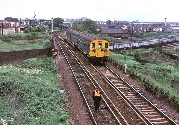 A Class 501 EMU seen here in May 1979. It is en route to Richmond and crossing the Western Region main line at Acton. Note the stabled sleeping cars. A lengthman is inspecting the permanent way in the foreground. The EMU is running on the 3rd rail section; part of the Richmond route was shared with the Southern Region and this involved some complex electrical circuitry to permit operation of the two types of train at different voltages. From 1970 the units were altered to 3rd rail operation but the 4th rail was of course retained on sections used by London Transport. Isolated sections of redundant 4th rail on non-LT sections could still be seen for some years afterwards.