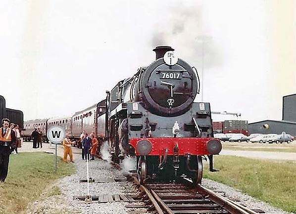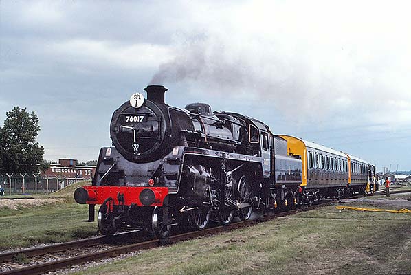 BR Standard 4MT 2-6-0 No.76017 at Marchwood on the occasion of The Branch Line Society's 'The Hampshire & Sussex Explorer' on 19 June 1993. No.76017 was present for a Families’ Day at Marchwood and did not operate any part of the railtour on the national network. She arrived at Marchwood under her own steam from the Mid Hants Railway, a journey which would have been straightforward had the southern section of the Mid Hants Line not been abandoned. On the same day at Marchwood, Class 47 diesel No.47213 was named 'Marchwood Military Port' to mark the 50th anniversary of the port's opening although it was not fifty years to the day.