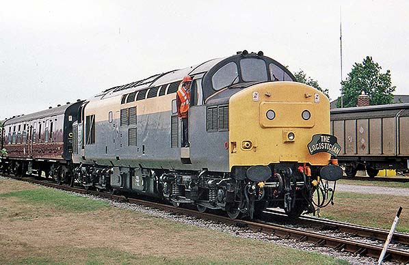 English Electric Class 37 No.37371 on the Marchwood Military Railway with Pathfinder Tours 'The Logistician' railtour on 24 June 1995. This tour ran to and from Bristol Temple Meads and took in Ludgershall as well as Marchwood. Three Class 37s were used although one, 37048, was a replacement for 37098 which failed at Didcot. The stock was a 6-car set and the Mark 1 seen here looks very smart in lined maroon livery. Note the bars over the passenger door droplights. A Ferrywagon can be partially seen on the right. These are lengthy bogie vehicles which come in a number of variations. None of three Class 37s used on ‘The Logistician’ survive. No.37371 entered traffic on 13 June 1963 as D6847 and was scrapped at Wigan in June 2001. Nevertheless, there is still work for Class 37 and number of them continue in service as of November 2016 with a large number now in preservation of which a few have been re-acquired and returned to the main line. Despite their age and notwithstanding various rebuilds, the class has proved to be among Britain's most dependable main line diesels ever.