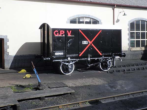 A restored gunpowder van seen here at Minehead in March 2013. The red cross on the doors is a 'No Smoking' warning. A number of these vans, of varying parentage (this one began life with the Great Western Railway), have been preserved but in comparison to the vast numbers constructed over many decades they are now rare.