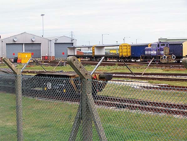 The view across the fence in May 2011 looking towards the locomotive shed and maintenance bay. This was a Sunday, the one day of the week that the military railway does not operate under normal circumstances. In the foreground is a Warwell wagon while in the background is a pair of PVA curtain-sided vans, minus curtains. Behind them is another PVA, with curtains present, plus what appears to be a VBA behind the DLO-liveried Thomas Hill shunter. By this date all these vans were most likely Internal User. Long wheelbase air-braked vans such as these had the advantage of being able to operate at higher speeds relative to the older short wheelbase vans which tended to become unstable and were restricted to, at best, 45mph or 60mph for the XP rated types. It was these long wheelbase underframes upon which the 'Nodding Donkey' Pacer DMUs were based but with a number of significant differences, not least the longer (30ft against 20ft 9in) wheelbase of the Pacer vehicles.