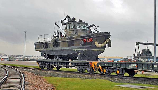 Army Work Boat WB 06 on a BAOR (British Army On The Rhine) Warflat at Marchwood on an unknown date. Work Boats are general hacks used for a number of purposes; firefighting for which they are fitted with a pump; diving support; barge towing; tenders. Their purpose at Marchwood appears to have largely comprised the towing of barges to and from moorings in Southampton Water. The cradles on which WB 06 is sitting can be removed from the wagon and placed on the deck of ships where they serve the same purpose as seen here. This particular type of Work Boat is believed to be no longer in service.