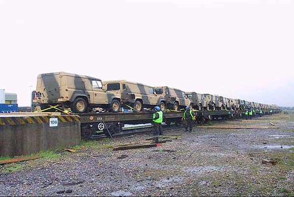 A fleet of Land Rovers loaded onto KFA Warflats, which are essentially container flats, at Marchwood on an unknown date. This photograph illustrates well the convenience of transporting fleets of vehicles and other equipment by rail, by which means it travels direct from depot to depot mainly in the hands of one person - the locomotive driver. The Land Rovers are the long wheelbase type, of which three can be accommodated on each wagon.