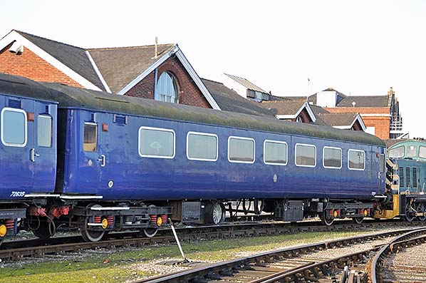 The ex-Gatwick Express Class 488 set in the sidings at Eastleigh Works on 16 December 2014. On this occasion the camera was on the opposite side of the train to the previous view. Note the set retained its Gatwick Express car numbers and did not receive army numbers; this was because the set arrived at Marchwood after the army ceased to operate the trains themselves. The livery is a variation of the standard DLO livery and would have looked very smart when freshly painted. Unsurprisingly car 72509, in particular, is showing signs of fading. It also lacks the crest applied midway along the bodyside of its partner, car 72635. As of November 2016 the set, we are informed by the photographer who is an employee at Eastleigh, is in store at Eastleigh works and is owned by Arlington Fleet Services. Thus set 488210 and one of Marchwood's ex-Class 501 cars are, as far as is known, the only survivors of the Marchwood Military Railway's passenger stock.
