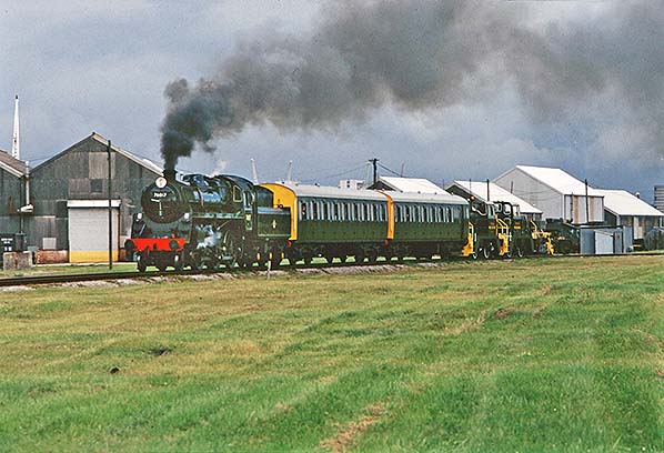 Marchwood on 19 June 1993, the occasion of the Branch Line Society’s 'The Hampshire & Sussex Explorer' Seen in this view is BR Standard 2-6-0 No.76017 with the Army's two ex-Class 501 coaches and pair of Thomas Hill shunters. The latter are recorded as being Army Nos.255 and 268 which, assuming that the numbers have been recorded correctly, is the only reference to this pair being at Marchwood. Both are carrying nameplates but which plates are not known as they remained at Marchwood and were applied/removed as locomotives came and went. The tour details make no mention of the ex-Class 501 coaches but clearly they were used. This view is believed to show the ensemble returning from Falklands Jetty via the Northern Line, after which the tour visited the Cracknore Hard branch but apparently using the main line stock.