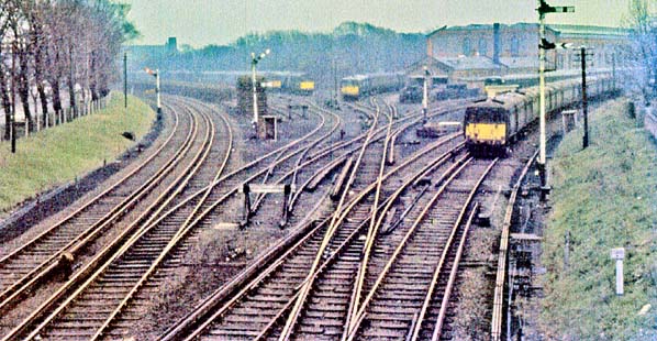 ![]() Looking south from Roe Lane Junction at the northern part of the Meols Cop triangle and the electric car sheds that were situated within it in April 1966. The line heading off to the right had been the route to Southport via Hawkshead Street Junction. It was closed by this time and in use as storage sidings. The line going left formed the eastern side of the triangle and ran down to Meols Cop Junction. The car sheds were still busy at this time as can be seen by the amount of rolling stock that