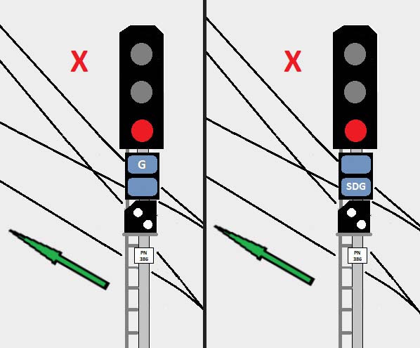 The photo (above) showing the remains of this signal are from behind, left mock up shows it from the front as it would have looked like from a driver's point of view. Here the main red light is on, meaning you are not carrying straight on, but the two white lights under it indicates you are coming of this line and going left and you can carry on. The “G” tells the driver that they are going onto the Rose Grove down goods line. The second mock (right) up is as the first, except SDG is showing, meaning the train is being routed onto the Rose Grove down goods siding.