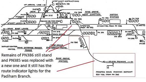 An extract from the 1973 re-signalling special notice from September of that year. This should help you understand where signal PN386 was located. As well as this signal, PN384 & PN385 were also connected with the branch to Padiham. Near PN385 was a "staff" instrument that was carried by the train down the Padiham branch and back. For safety reasons (this now being a single track) no other trains could be on the line at the same time. Without the staff, a signalman could not operate the points onto the branch nor operate the lights for it. When a train returned to Rose Grove the staff was replaced back near PN385. Click here for a larger version.