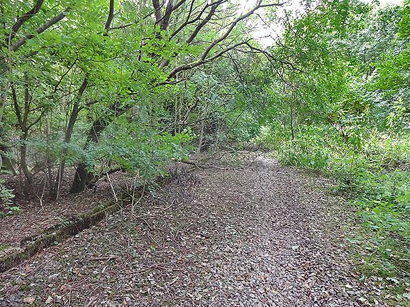 On the left you can see a grid or trough which carried cables alongside the former track. At this point we are looking uphill back towards Rose Grove in the east in September 2018.