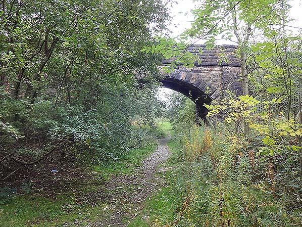 One of two stone bridges on the Padiham bank near Rose Grove is partially hidden away from the level of the former track bed. It's not just weathering that has partly coloured the bridge grey, steam locomotives ran this line right until the end of steam at the start of August 1968. We are looking east towards Rose Grove uphillin September 2018. This bridge is the one carrying Molly Wood Lane over the track bed. The Padiham Greenway path has diverged away from the original line here and leads to the lane itself. Directly behind us is a newer bridge carrying the M65 over the line.
