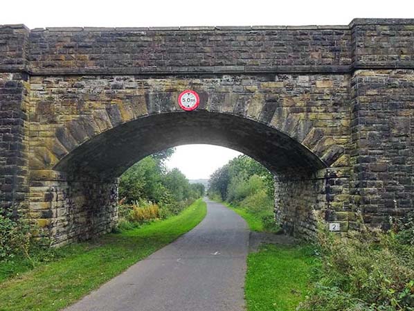 The second stone bridge near Rose Grove (September 2008) is a little closer to Padiham and the tarmac path that runs under it mainly covers the former down line and is part of the Padiham Greenway route. Here we are looking towards Padiham (west) as the path takes us down the bank away from the Rose Grove (east) end. This second bridge was an occupation bridge that gave access to the fields either side of the railway line. The height clearance sign states 5.0 meters, that's 16 feet 4 inches.