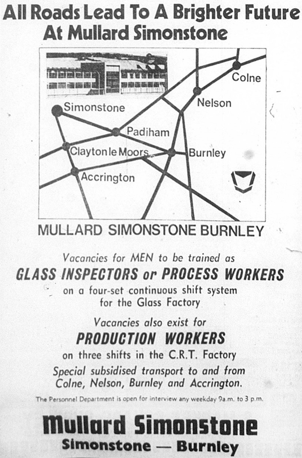 A poster advertising job vacancies at the Mullard Simonstone factory 2 February 1971. By this time the factory was employing 3,000 people which gives you an idea of just how big this factory was. One thing the factory was offering was subsidised travel to and from work, something I'm sure they would have done if only British Rail had allowed employees to travel by train from Blackburn to Simonstone on the 6.32 am. Instead, BR cancelled that particular train's stop at Simonstone on the very day the factory opened, they never re-instated that stop. All other trains either side of the 6.32 am one all called there.