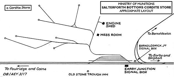 During the First World War the Ministry of Munitions opened a cordite store and dump at Salterforth Bottoms immediately south-west of Barnoldswick Junction and extending across what is now the B6383 road between Kelbrook and Barnoldswick (built in 1929) as far as Acornlea Hall near Foulridge. Cordite is an explosive; it was manufactured during World War 1 at various locations, including Gretna (where there was an extensive, purpose-built railway system including stations for workers on the site) but it is understood that no manufacturing was ever carried out at Salterforth. The site was selected because of its accessibility by rail and the absence of settlement on this almost flat valley floor (avoided because of its susceptibility to flooding); it also adjoined the Leeds & Liverpool Canal at the rear of Bashfield Farm where the boxes of cordite could be delivered or dispatched by barge. A number of storage huts were constructed on short concrete pillars at various locations within the site, around which was a perimeter fence. The facility at Salterforth Bottoms was open in 1916 as indicated by alterations to the Midland Railway Distance Diagrams which adds ‘Earby Ammunition Works Sidings’ 13 chains (286yd) from Barnoldswick Junction; the four sidings were constructed on the up side of the Skipton-Colne line. A new signal box called Earby Junction was built to serve the sidings. Within the munitions site a network of narrow gauge railways served the cordite stores which were spaced at safe intervals within the site; one of the branch termini was over 1¼ miles from the four ‘Earby Ammunition Works’ sidings. An engine shed was provided within the munitions site. The exact layout of the railway within Salterforth Bottoms is not known, but the accompanying map is a re-drawn sketch by Donald Binns in his book Skipton-Colne Extension (2008) and from which some of the material in this article is derived. The Ministry of Munitions railway system is shown on the accompanying OS One-inch Popular Edition map (Sheet 25: Ribblesdale). The publication date is 1924, but the revision is dated 1920, with a road revision date and minor corrections of 1933 and issue code of 1934.
