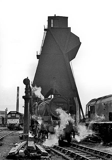 The imposing mechanised coaling stage which dominated the skyline around the depot was a variation on the No1 type and had a capacity of 300 tons. Standing on the disposal roads are ex-LMS Black 5 Mixed Traffic class 4-6-0 45308 with BR Sulzer type 2 D7584, later class 25, 25 234 in the mid 1960's. ![]()