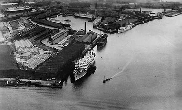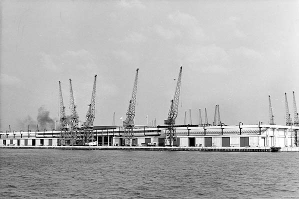 Photo from Bert Moody collection ![]() The four funnelled vessel is alongside berths 35/6 - the former Prince of Wales Quays (part of the Ocean Quays) along the River Itchen. The Empress Dock is the diamond shaped basin beyond it.