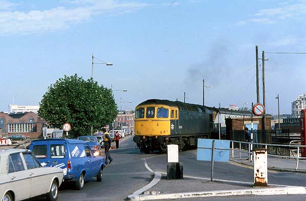 A boat train is seen crossing Central Road, Eastern Docks, approaching the