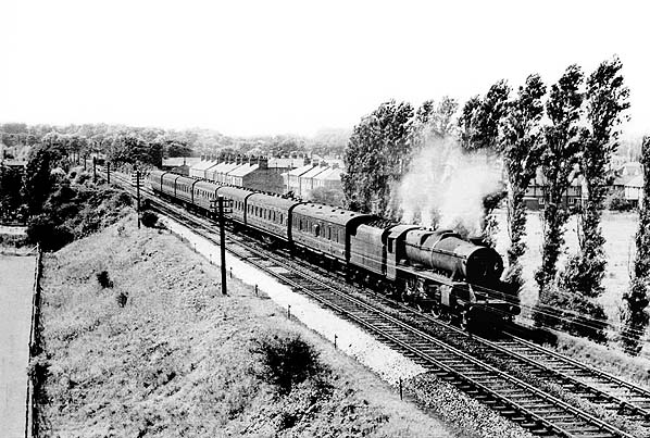 ![]() In July 1964 Stanier 'Black 5' 4-6-0 No. 45375 is about to pass underneath the six tracks of the West Coast main line on the approach to Whitehouse West Junction with the 1.50 pm Southport - Preston. In the distance is Leyland Road bridge with, immediately beyond that, the site of the former Middleforth Junction and the long-closed spur to Ribble Junction that used to provide direct access to Preston (Fishergate Hill) terminus from the east. That section of the line over which No. 45375 is passing is not part of the original WLR route, being constructed a year later, in 1883, to provide a route for WLR trains to travel to Blackburn and beyond, via the East Lancashire line. Upon takeover of the WLR by the L&YR in 1893, and with the subsequent closure of Fishergate Hill to passengers from 16th July 1900, all services started to use this section of line and a new north curve from Whitehouse West to gain access to the former East Lancashire Railway platforms at Preston. Built by Armstrong Whitworth for the LMS in June 1937, this loco lasted until the final year of steam on BR when it was withdrawn from Edge Hill Shed in January 1968. Scrapped by Cohens of Kettering, it had had a working life of well over 30 years.