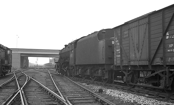 Carterhouse Junction looking west from the signal box in 1968. An ex LMS class 8F locomotive has just come off the deviation line and is heading towards Warrington. The deviation lines can be seen curving off to the right. Going to the left is the original route of the Garston and Warrington railway via Widnes Dock Junction.