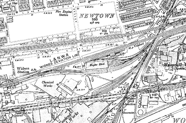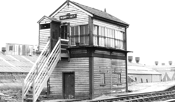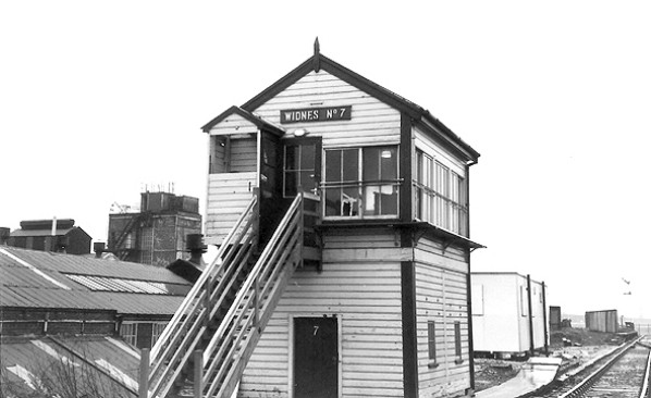 The 1/97 gradient from Widnes West Deviation levels out at the point where the deviation line passes over Victoria Road on a bridge. On the east side of the bridge was Widnes station which opened on 1 March 1870 (renamed Widnes South on 5 January 1959) and closed to regular passenger services on 10 September 1962. At the east end of the station was Widnes Junction. This was the point at which a spur veered away from the main line and provided a connection to the St Helens line. When the deviation line opened a signal box called Widnes No.7 was provided to control the junction. It was located on the north side of the line at the eastern end of Widnes station's up platform. In 1893 the box was replaced by an LNWR type 4 timber structure that had a 20 lever frame. Only 13 of the levers worked the other 7 being spares. The 1893 Widnes No.7 box cost £265 to build and fit out. The box closed on 18 April 1982 when the St Helens line closed completely.