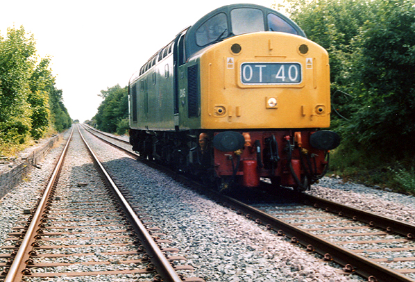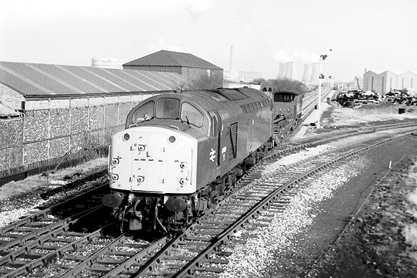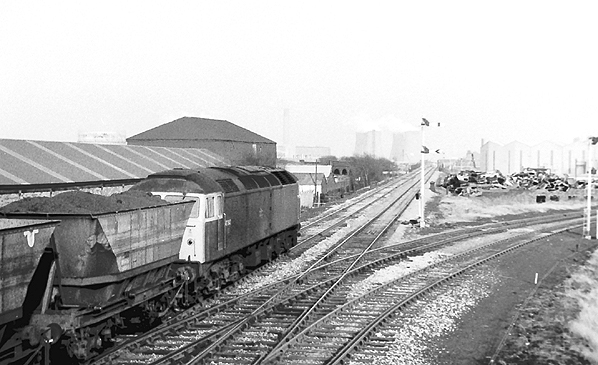 At 13.48 on 5 March 1982 class 40 number 40 099 heads west over Widnes Junction with train 9T62 a ballast working. The view was taken from Widnes No.7 signal box.