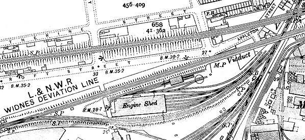 The Widnes Deviation St Helens line spur shown on a 1905 map. The spur diverges from the main line at the bottom left of the map. In the top right it joins the St Helens line and passes under the deviation. Between the spur and the main line was the Widnes Engine Shed.