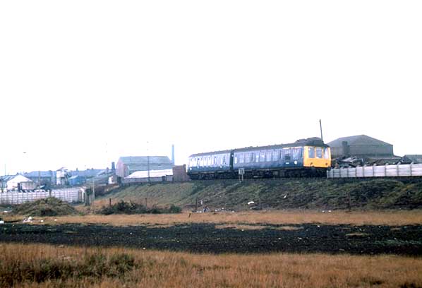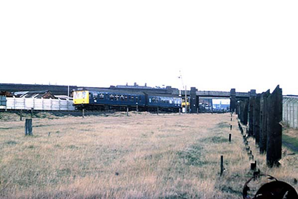 Looking north at the same DMU as in the picture above is seen at the end of the deviation spur line. The junction between the spur and the St Helens line had been just to the right of the DMU. The photographer is looking along the route of that line which had closed from Ann Street to Widnes Dock Junction in 1968. The bridge seen in the distance carries the deviation main line