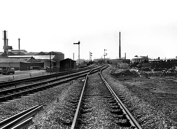 Looking west along the course of the Great Central & Midland Joint Railway Widnes Branch (GC&MR Joint) railway in November 1975. The deviation line is seen to the left and Anne Street East to the right. The area of stone setts seen in the centre of the view had been part of van access road to Tanhouse Goods Yard. The LNWR deviation and the GC&MR Joint came very close to each other at this point by in the period when the latter was open as a through route there was no connection between them. In distance to right can be seen Widnes No.2 signal box which was on the St Helens line.