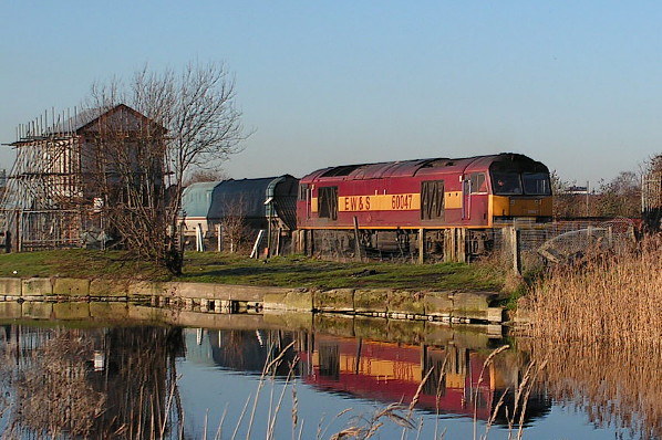 A class 60 hauled coal train passes the boarded up Carterhouse Junction signal box on 28 December 2005. Wearing EWS livery 60 047 is reflected in the Sankey canal.