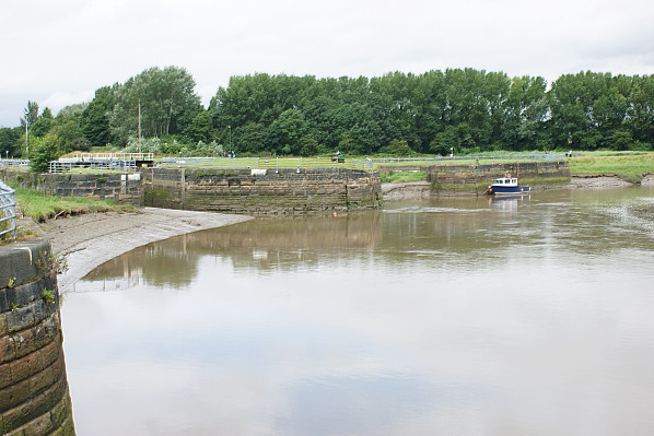 Looking north towards the entrance to the Widnes Dock and the Sankey Canal on 17 July 2012. The dock entrance was just to the left of the blue boat. The canal entance can be seen further to the left. The picture illustrates how close the one time rival Sankey Canal and the Widnes Dock are to each other.
