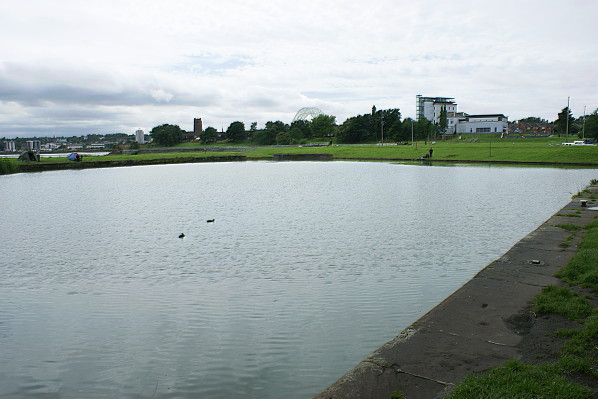 Looking west at Widnes Dock on 17 July 2012. In the distance can be seen the arch of the Silver Jubilee Bridge which spans the River Mersey at the Runcorn Gap. The river itself can be glimpsed beyond the dock. Photo by Paul Wright