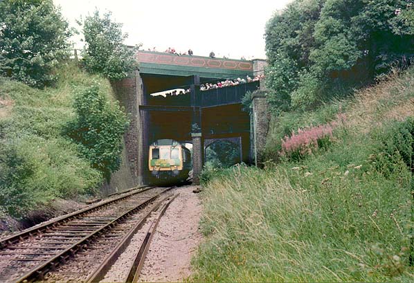 A DMU shuttle service run by the Great Western Railway Preservation Group to celebrate the 125th anniversary of the Three Bridges is just passing under Windmill Lane bridge bound for Southall on 15 July 1984. Photo by John Wells