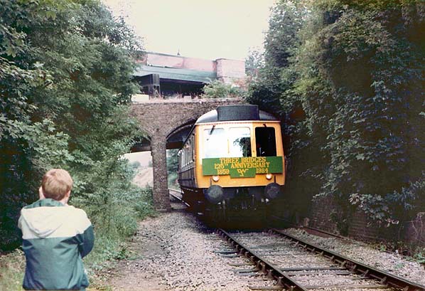 A DMU shuttle service run by the Great Western Railway Preservation Group to celebrate the 125th anniversary of the Three Bridges has just passed under Windmill Lane bridge bound for Brentford on 15 July 1984. Photo by John Wells