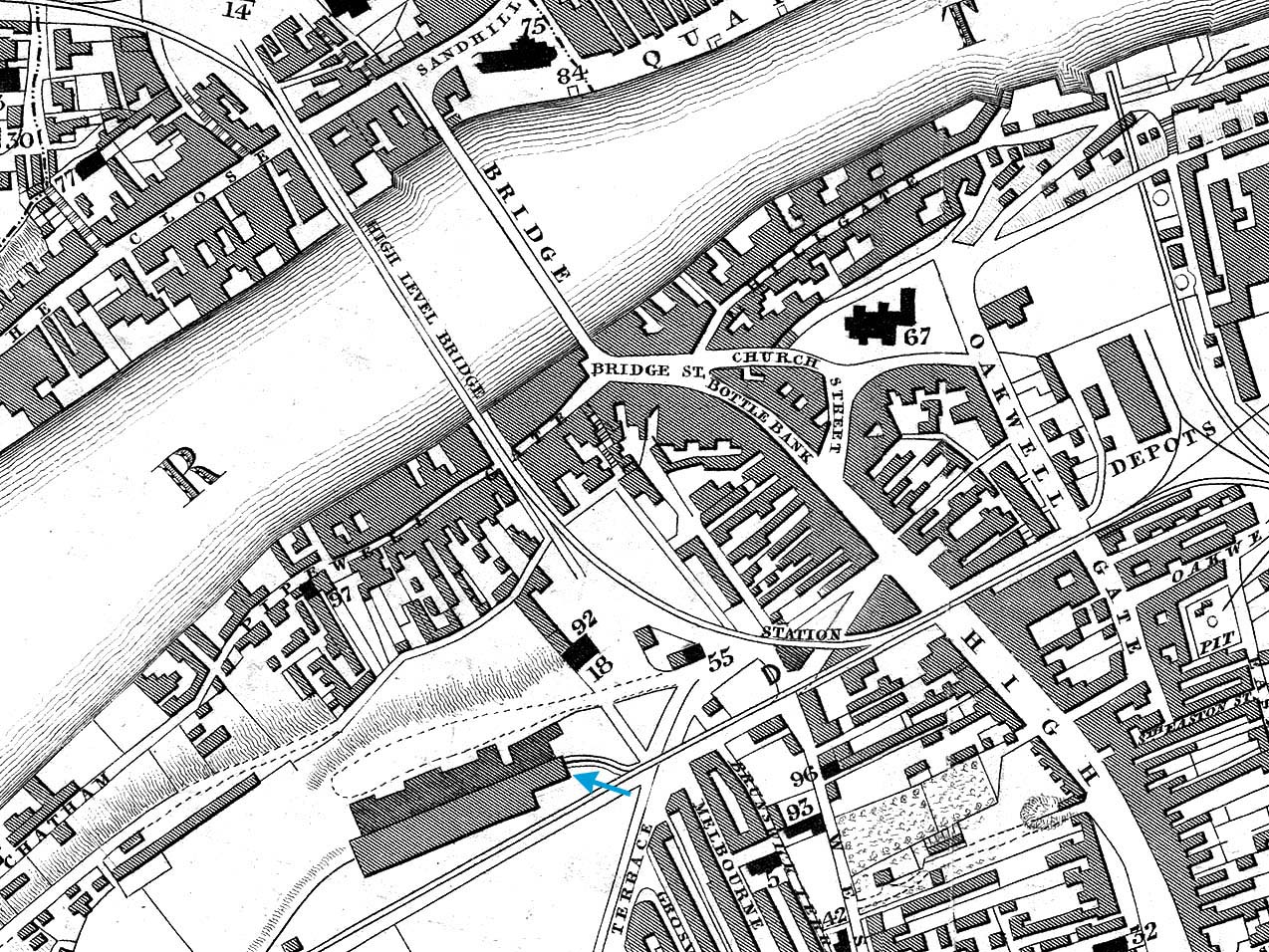 The High Level Bridge over the River Tyne opened to regular passenger traffic on 15 August 1849, replacing an adjacent temporary structure which was in use for some months. This important link permitted through trains via the East Coast ‘Old Main Line’ to travel between London and Newcastle. The main line’s Gateshead terminus at Greenesfield (arrowed, and directly south of High Level Bridge) closed on 30 August 1850, and the following day the extended main line opened through to Edinburgh, with a station provided in its place on the through route – labelled ‘Station’ on the map, but without any detail of platforms or building