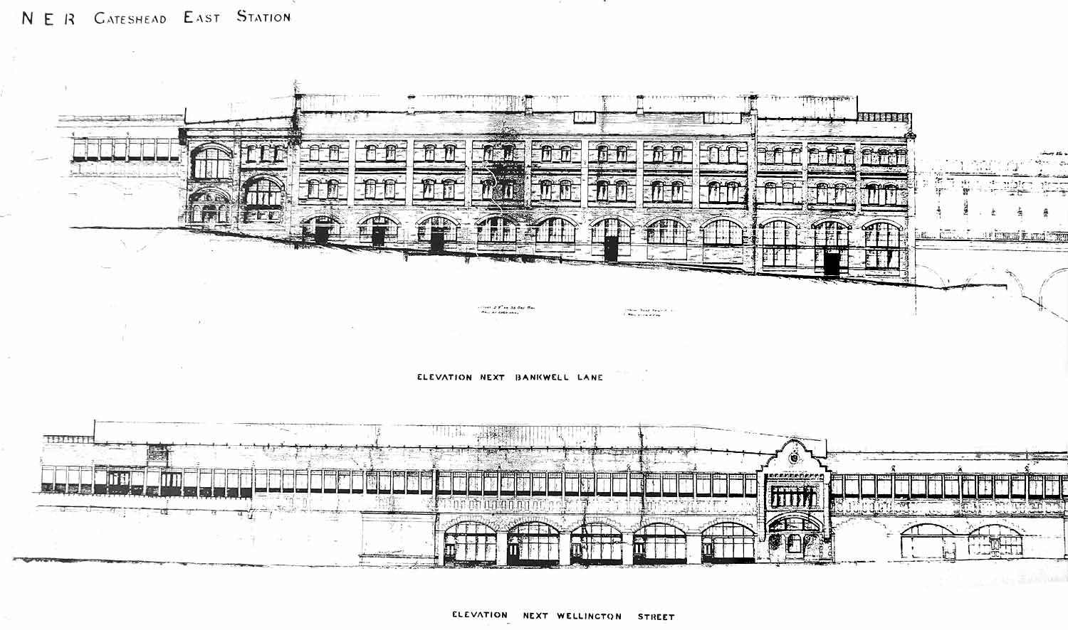 ![]() Elevations of Gateshead East station (1925). The station building, extending to three storeys at its northern (right) end on Bankwell Lane is shown above. Although the main entrance is on Wellington Street there are no facilities on the adjoining up platform, only a screen wall to support the station roofing.