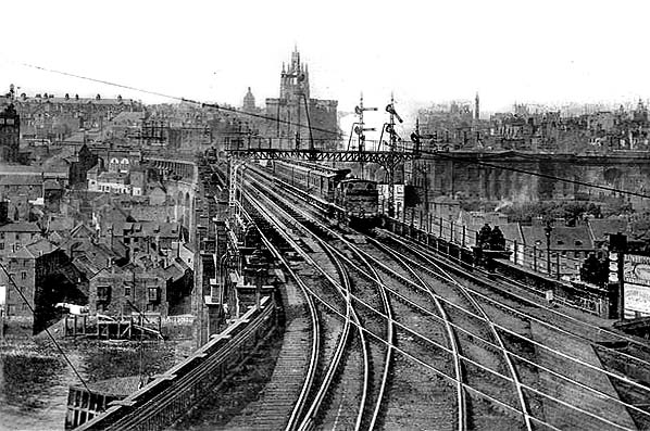 A passenger train is seen c1913 crossing the High Level Bridge from Newcastle to Gateshead East. The view is looking north-west from the footbridge above the tracks through Gateshead West. Photo from John Mann collection