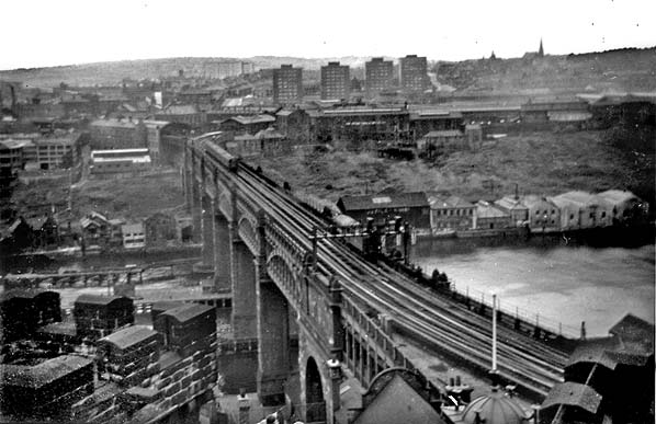 The Castle Keep immediately east of Newcastle Central station, from which this photograph is taken, has a commanding view over the station as well as across the Tyne; little wonder that the North Eastern Railway considered – and rejected - using its strategic position for a signal box. In August 1958 an EMU from South Shields is seen at the far end of the High Level Bridge having called at Gateshead East, whose roofing can be seen behind the train and to its left. The roofing of Gateshead West station is to its right and, beyond and extending to the edge of the photograph, the buildings are of the Gateshead railway engineering works which include the site of Gateshead Greenesfield terminus which closed to passengers in 1850.