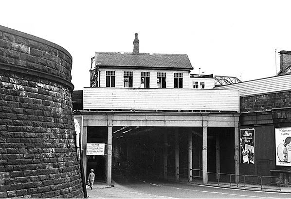 Looking north-west along the lower (road) deck of the High Level Bridge from Wellington Street, Gateshead in July 1969. The stationmaster’s office building between Gateshead West and East stations is seen above the entrance to the bridge. Behind the building the footbridge can be seen.