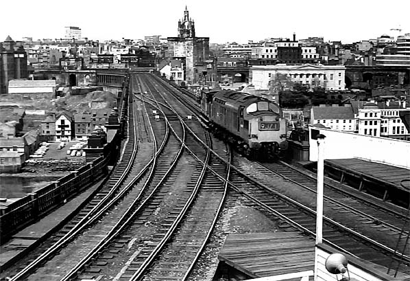 Looking north-west in May 1971 from the footbridge which links Gateshead East and West stations. The loco is leaving High Level Bridge and is about to enter Gateshead East, whose wooden platforms can be seen on the right. The tracks curving leftwards pass through Gateshead West station which closed to passengers in 1965.