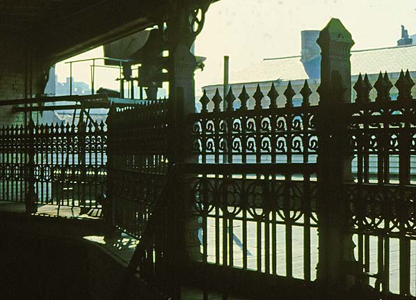 In April 1980 the entrance to the up platform at the head of the staircase at Gateshead East retains elaborately detailed iron barriers of North Eastern Railway vintage. The image shows a sliding gate, which would have allowed access to the platform from the stairs without passing through