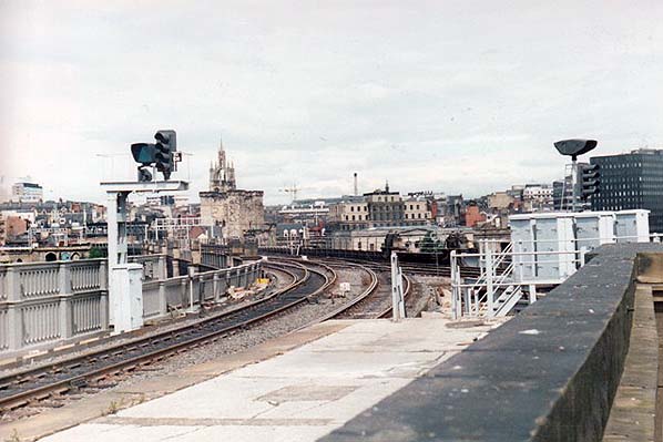 ![]() Looking north from the northern end of the up platform of Gateshead West station in July 1988. The East station platforms were formerly to the right of the picture. The tracks in the foreground are curving towards the High Level Bridge which crosses the River Tyne gorge. Newcastle’s Castle Keep and St Nicholas’ Cathedral tower are seen beyond the bridge. Although indistinct, it is just possible to see the black-and-white metal NER trespassing notice on the left and just beyond the signal gantry.