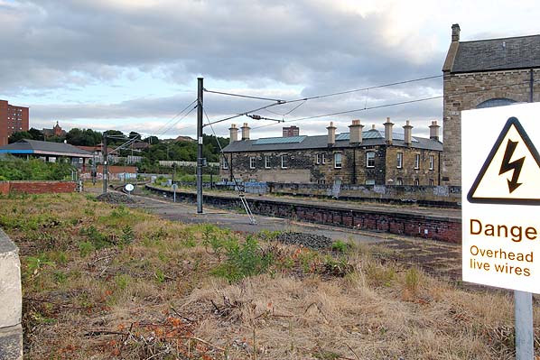 ![]() Looking south-west along the former up platform of Gateshead West station in June 2011. The site of the former Greenesfield station and Gateshead railway works complex are to the right. Note the provision of electric overhead wiring for the remaining single track as part of the East Coast main line electrification. Photo by Nick Catford