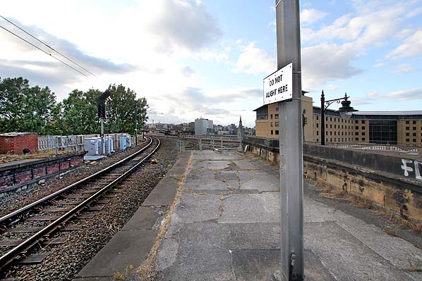 ![]() Looking north-east from the former up platform of Gateshead West station in June 2011. A notice attached to the gantry in the foreground discourages passengers from alighting at the platform which has been out of use for 46 years. The former up platform can be seen to the left. In the background the single track joins the Sunderland – Newcastle route just before the High Level Bridge. Photo by Nick Catford