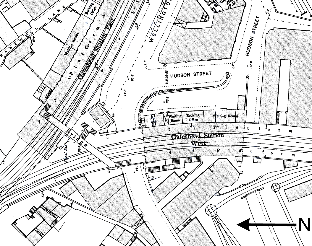 ![]() In 1868 the two platforms known as Gateshead West station were added to the island platform of the original Gateshead station, which became Gateshead East. The latter was reconstructed with two side platforms in 1884-6. Vehicle and pedestrian access to Gateshead West was via a short approach road sloping up from the newly built Hudson Street. The station building on the up (south-east) platform, with booking and extensive waiting facilities, can be seen at the head of the approach road. The down platform had only a screen wall, and the trainshed provided shelter for waiting passengers. The extent of the trainshed (roofing) at each station is indicated by a pecked line across the platforms and tracks. A footbridge at the northern end connects the four platforms of the two stations.