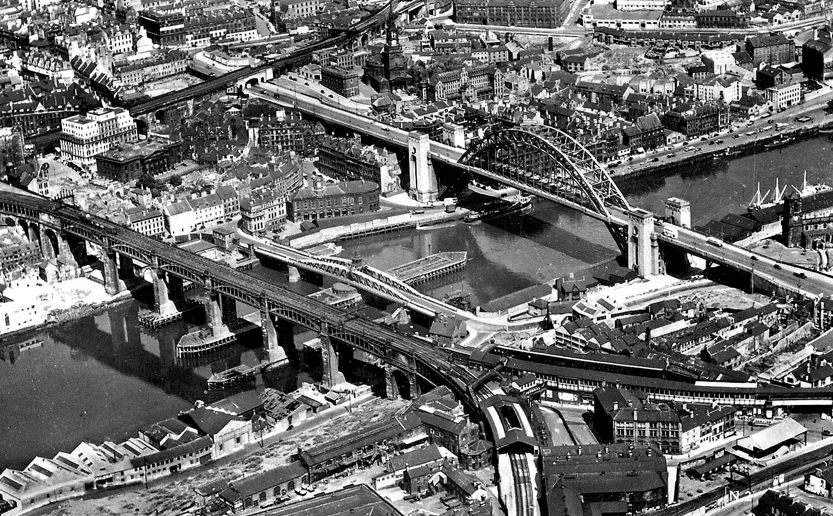 ![]() An aerial view of the two Gateshead stations looking north-east. Crossing the Tyne are, from left to right) the High Level Bridge (opened 1849) with the railway carried above the road; the Swing Bridge (1876) and the Tyne Bridge (1928) which, until 1967, was the route of the A1 road. Gateshead West station is seen just right of centre at the bottom of the photograph with East station immediately beyond, both with trainsheds. Immediately left of West station is the former Greenesfield station hotel which is part of the railway workshops comple