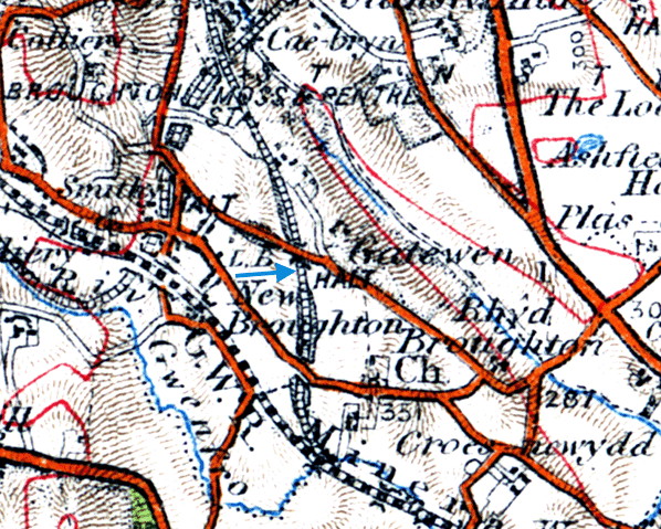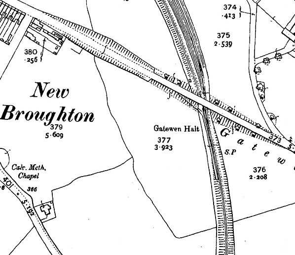 Notes: Gatewen Halt was situated on the Great Western Railway (GWR) Moss Valley branch which ran from a junction with the Wrexham & Minera Railway at Moss Junction to Moss and onwards to Brynmally Colliery. The line opened as a single-track railway on 11 May 1882. At two miles in length it had been constructed so that locomotive-hauled trains could reach collieries and other industrial premises at the north end of the Moss Valley. A railway from Wheatsheaf Junction, on the Chester and Shrewsbury line, to Minera had opened in 1847 and it passed through Moss and so was able to serve the industries there. The 1847 line was a great success, but it was very steeply graded and had two rope-worked inclines which, as the nineteenth century progressed, impeded the smooth flow of traffic. The Moss Valley branch improved the situation greatly.