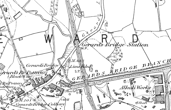 Notes: Gerards Bridge station was on the St Helens Canal & Railway Company’s (SHC&RC) St Helens and Rainford Junction line which opened on 1 February 1858. The line was actually part of a through route between St Helens and Ormskirk, the section between Rainford Junction and Ormskirk being built by the East Lancashire Railway (ELR). Both companies had co-operated in building the two lines, the relevant Acts being granted on the same day in 1853. At Rainford Junction the line connected with the Lancashire & Yorkshire Railway (LYR) Liverpool and Wigan route.