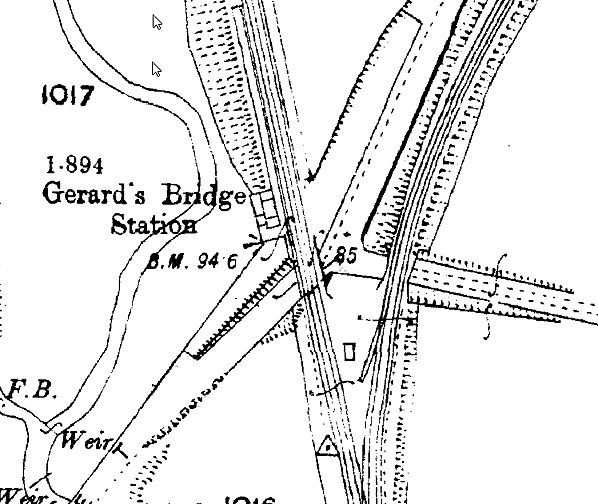 In 1890 the line was doubled and Gerards Bridge received a second platform for trains towards St Helens whilst the original served Rainford trains. The St Helens platform had a simple waiting shelter and steps provided direct connection to Haresfinch Road.
